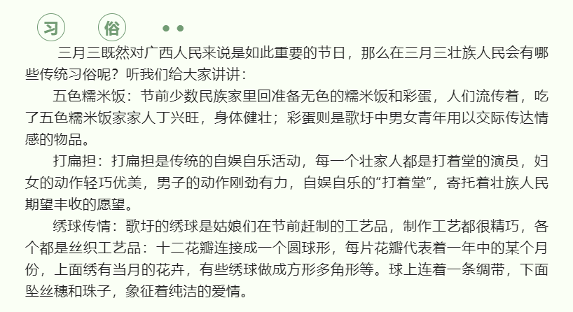 “三月三”是中国多个民族的传统节日,时在农历三月初三,其中以壮族为典型。一提到三月三,人们就会联想到咱们广西。2014年“壮族三月三”申遗成功,三月三成为了咱们广西壮族及各民族文化推上国际舞台的一个重要形式和载体,每年三月三广西全区人民享有两天的假期。